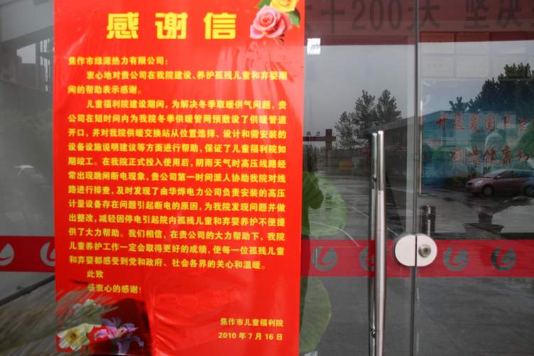 2010年7月19日上午,焦作市兒童福利院李院長帶隊(duì)一行4人來到綠源熱力公司,對綠源公司在兒童福利院建設(shè)、養(yǎng)護(hù)孤殘兒童和棄嬰期間的幫助表示感謝!
